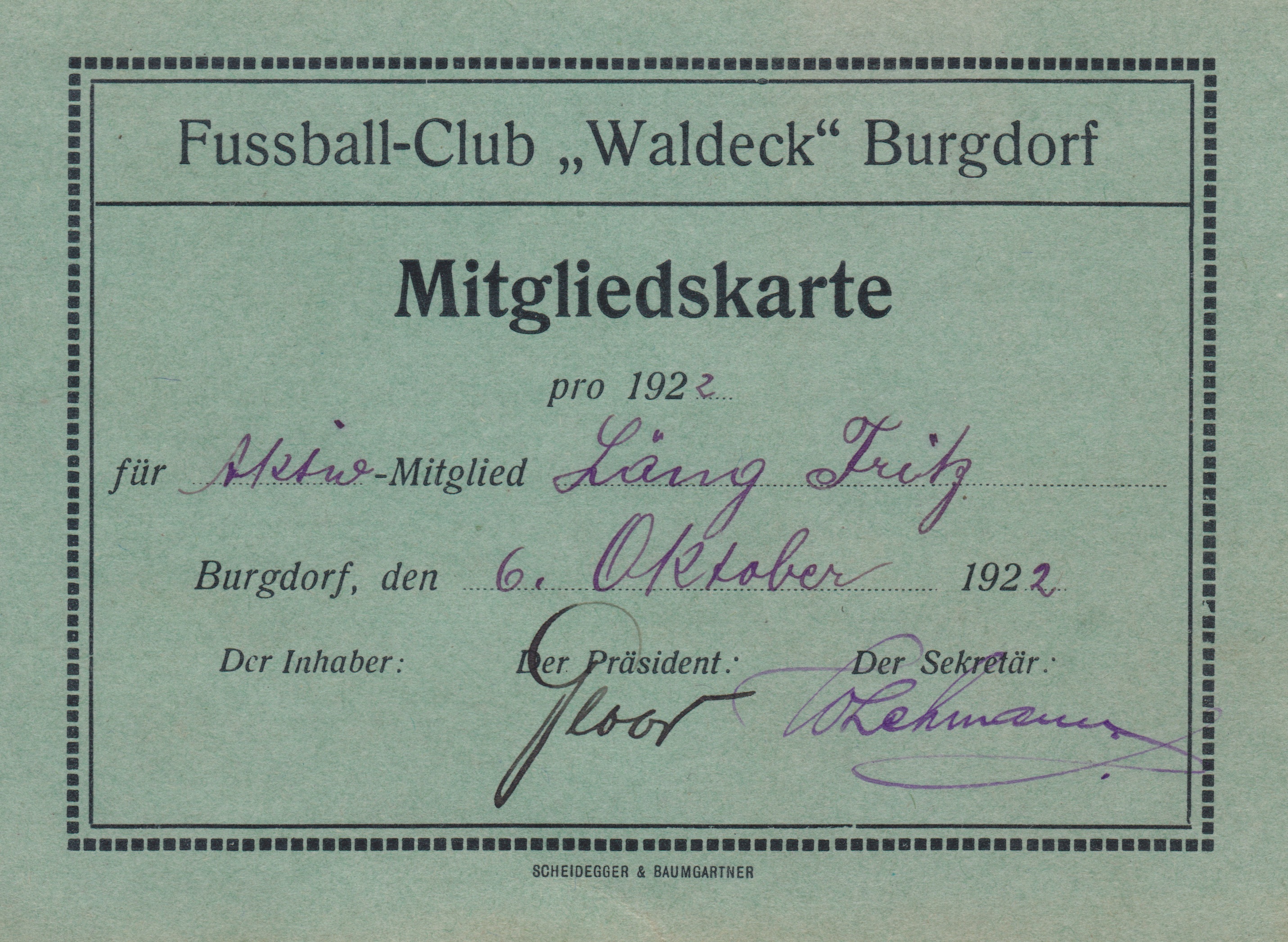 Scheidegger & Baumgartner 1922Mitgliedskarte für Aktiv-Mitglied Läng Fritz. Der FC Waldeck war Vorgänger des FC Burgdorf.