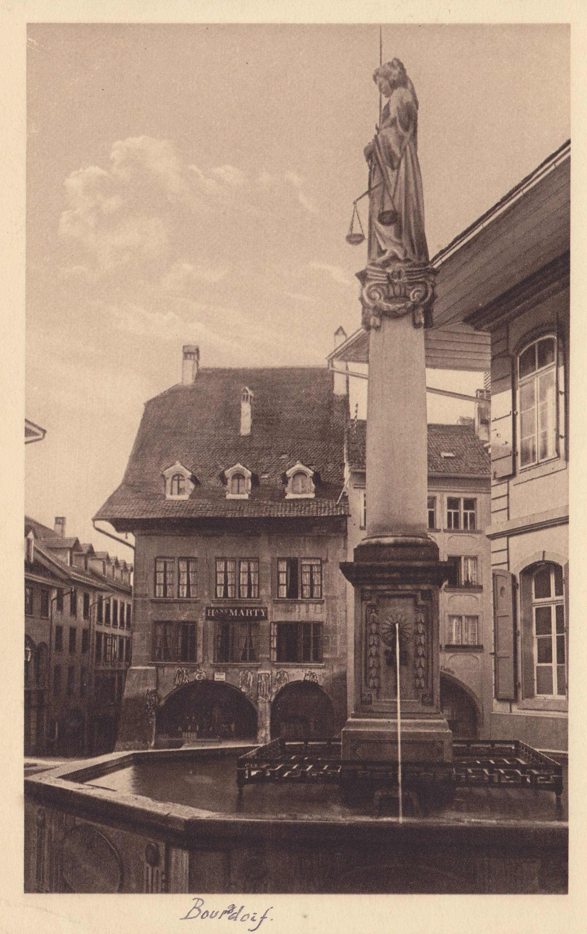 Franco-Suisse, Edition, Bern 1915Kronenplatz, Gerechtigkeitsbrunnen, hinten das Geschäft von Hans Marty.