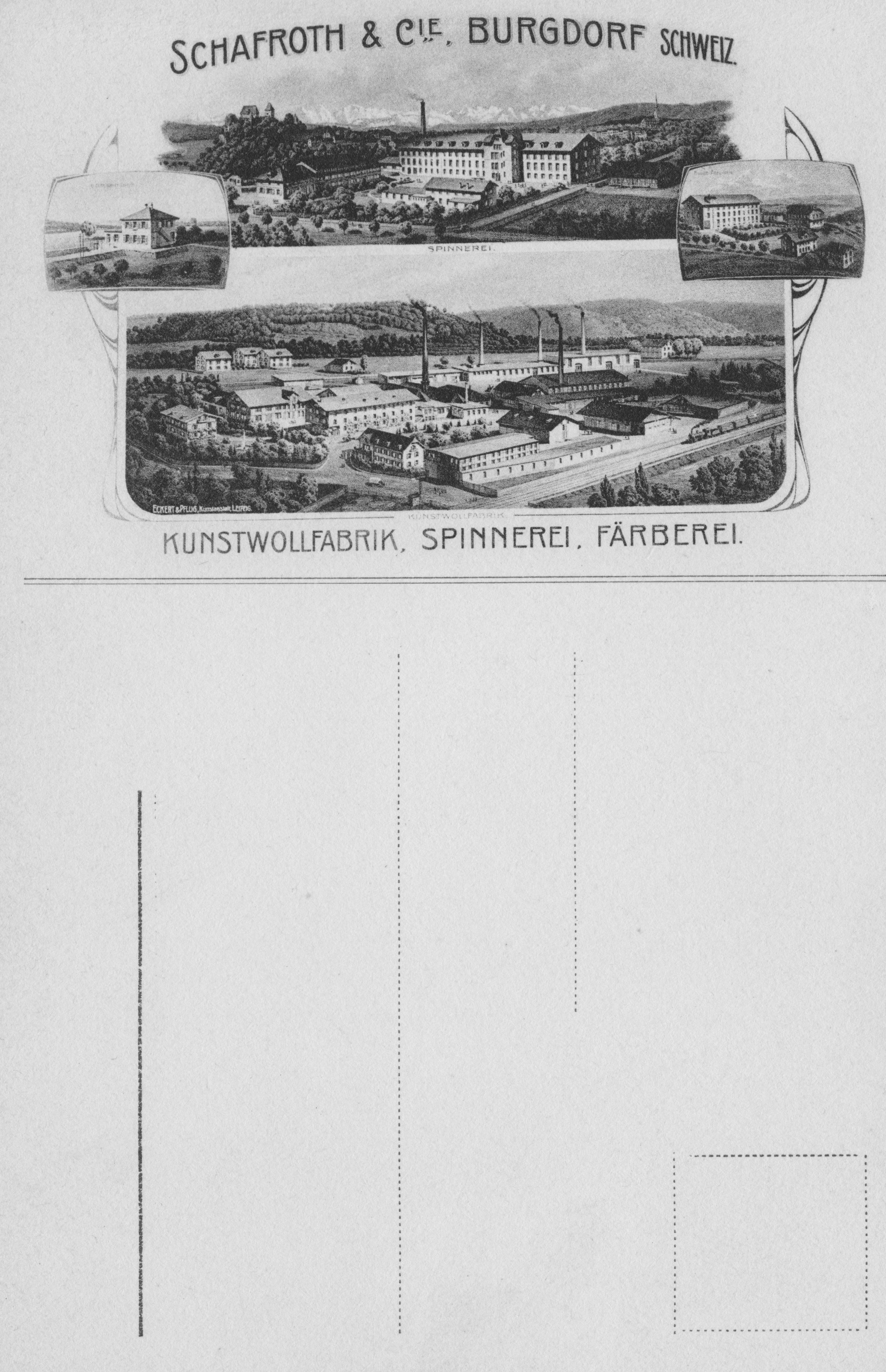 Postkarte von Schafroth mit Ansicht der Spinnerei an der Sägegasse und der Fabrik beim Bahnhof.