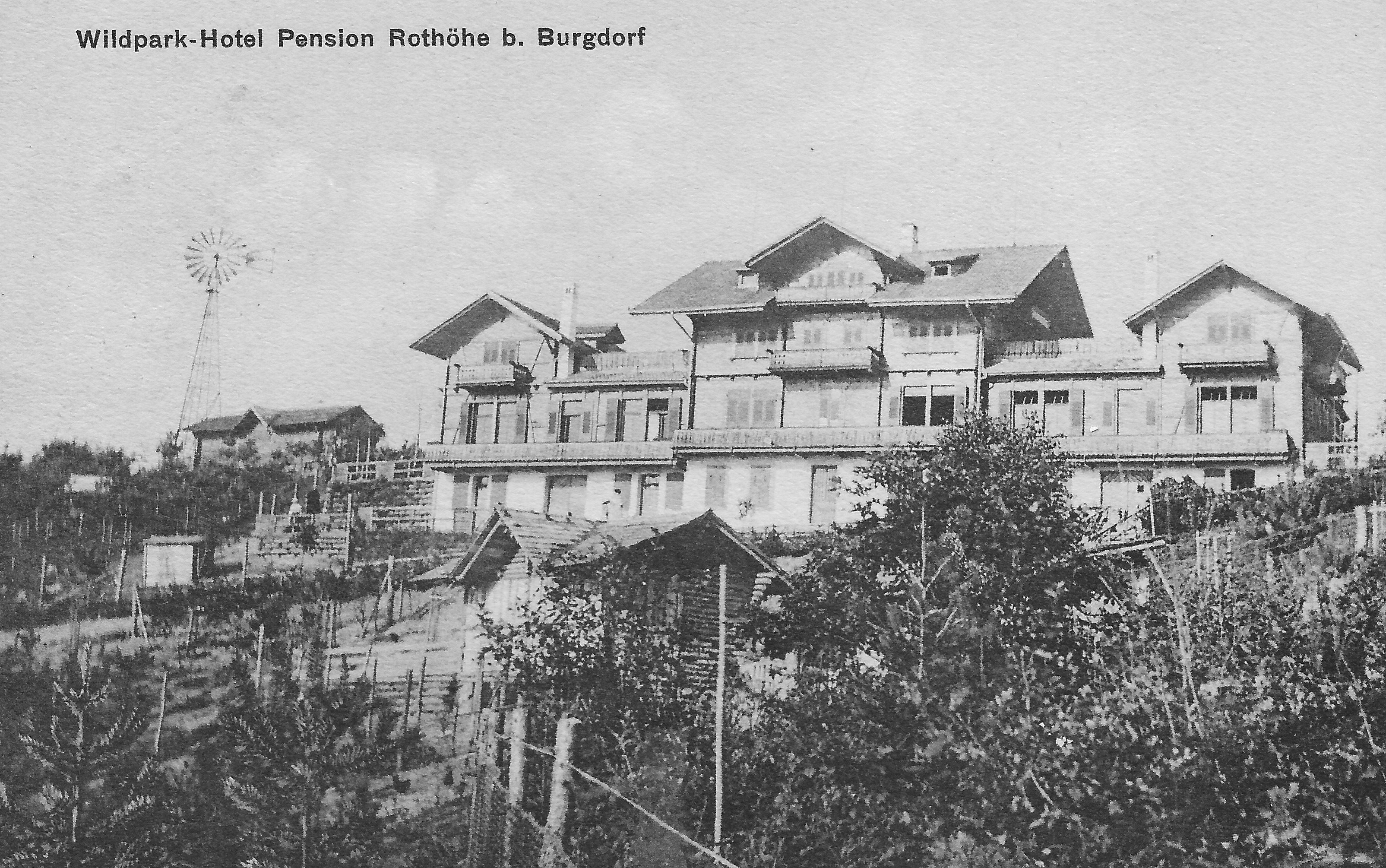 Das ausgebaute Wildpark-Hotel mit Windrad. Schon damals hatte man alternative Energien genutzt.